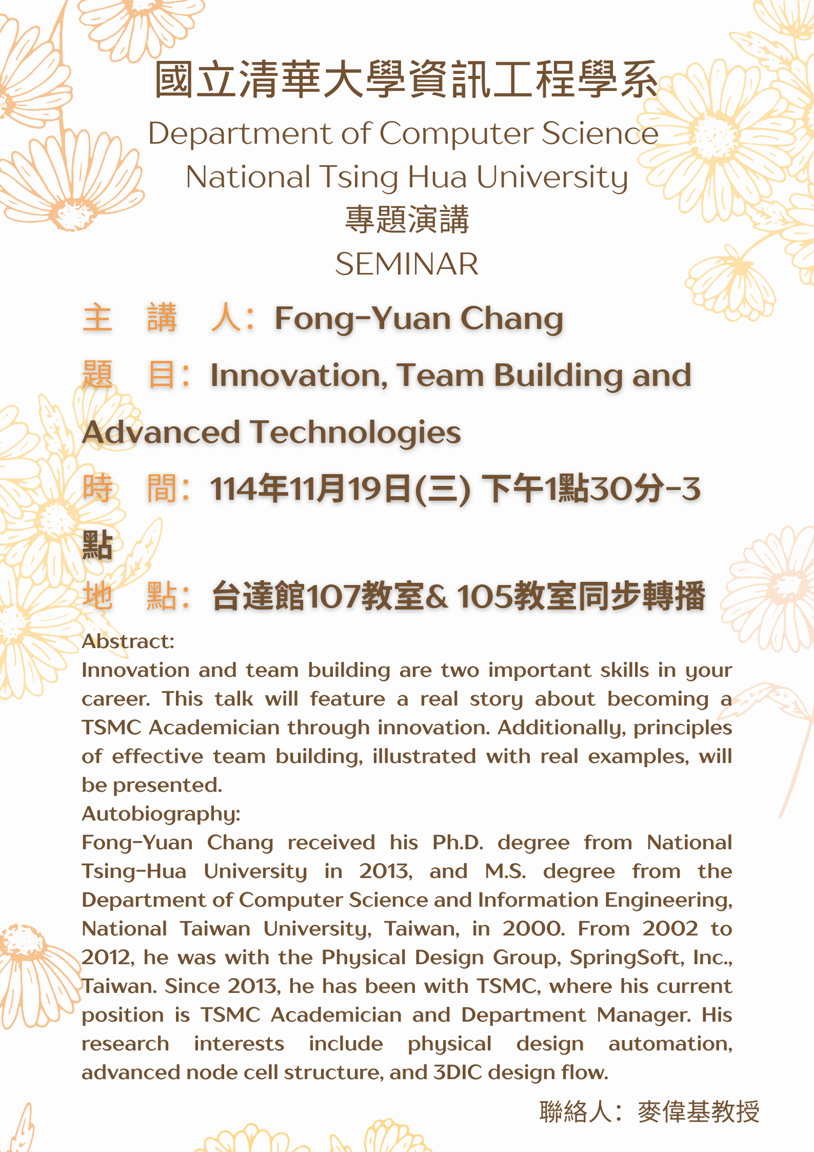 11/19 (三) Innovation, Team Building and Advanced Technologies 主講人: Fong-Yuan Chang