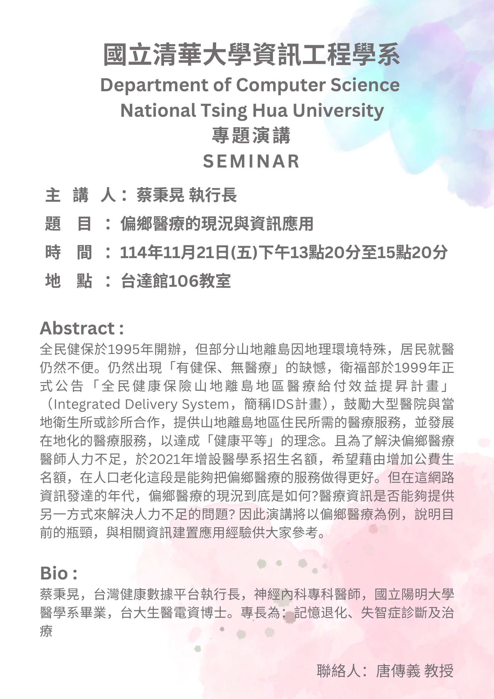 11/21 (五) 偏鄉醫療的現況與資訊應用 主講人:蔡秉晃執行長