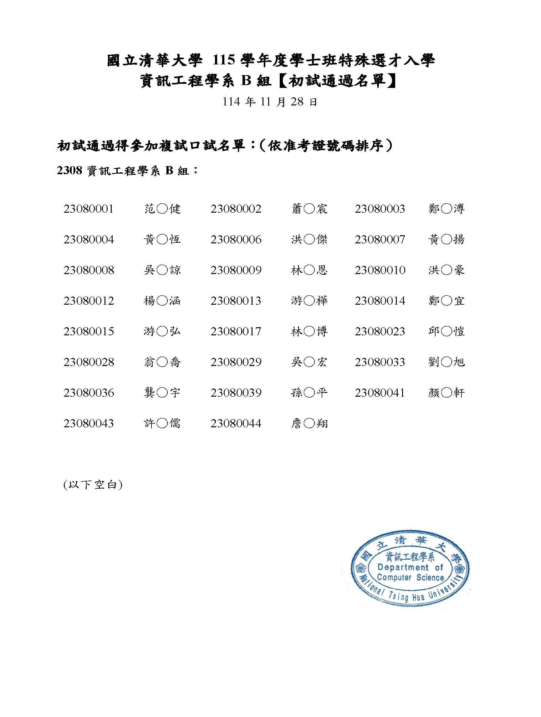 【115學年度大學特殊選才入學】資工系B組-初試通過名單