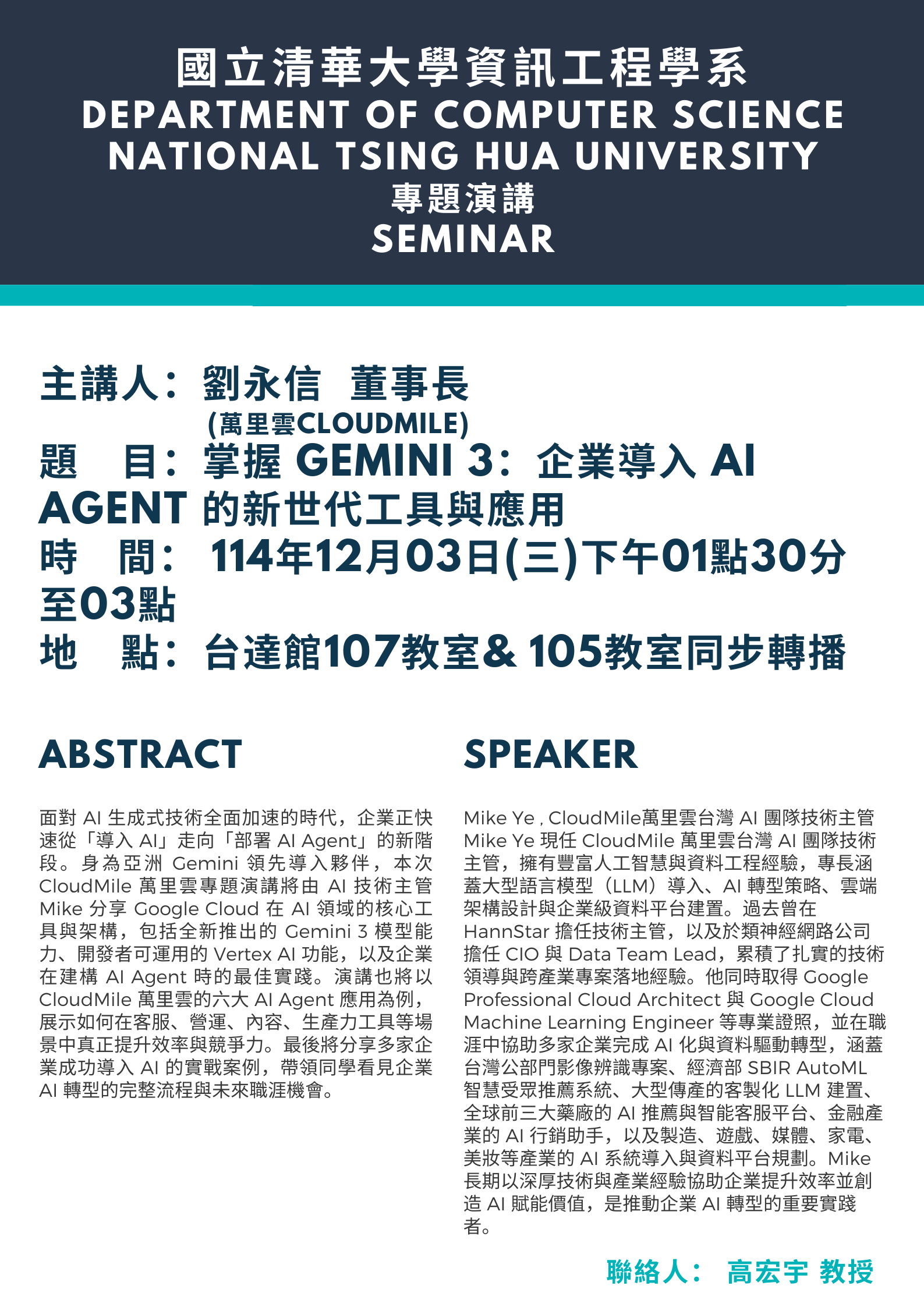 12/3(三)掌握 Gemini 3:企業導入 AI Agent 的新世代工具與應用 主講人:劉永信董事長