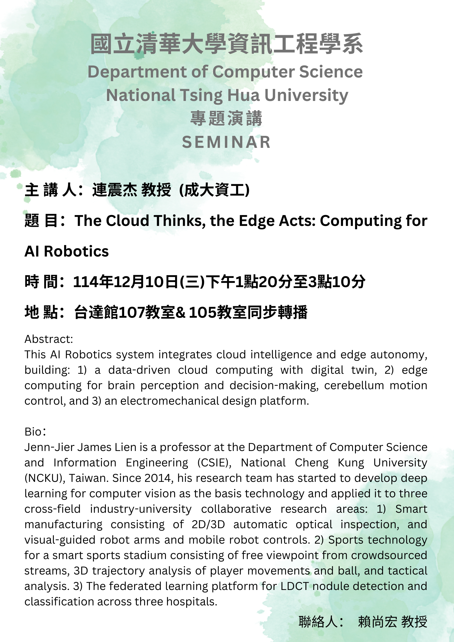 12/10 (三) The Cloud Thinks, the Edge Acts: Computing for AI Robotics 主講人:連震杰教授