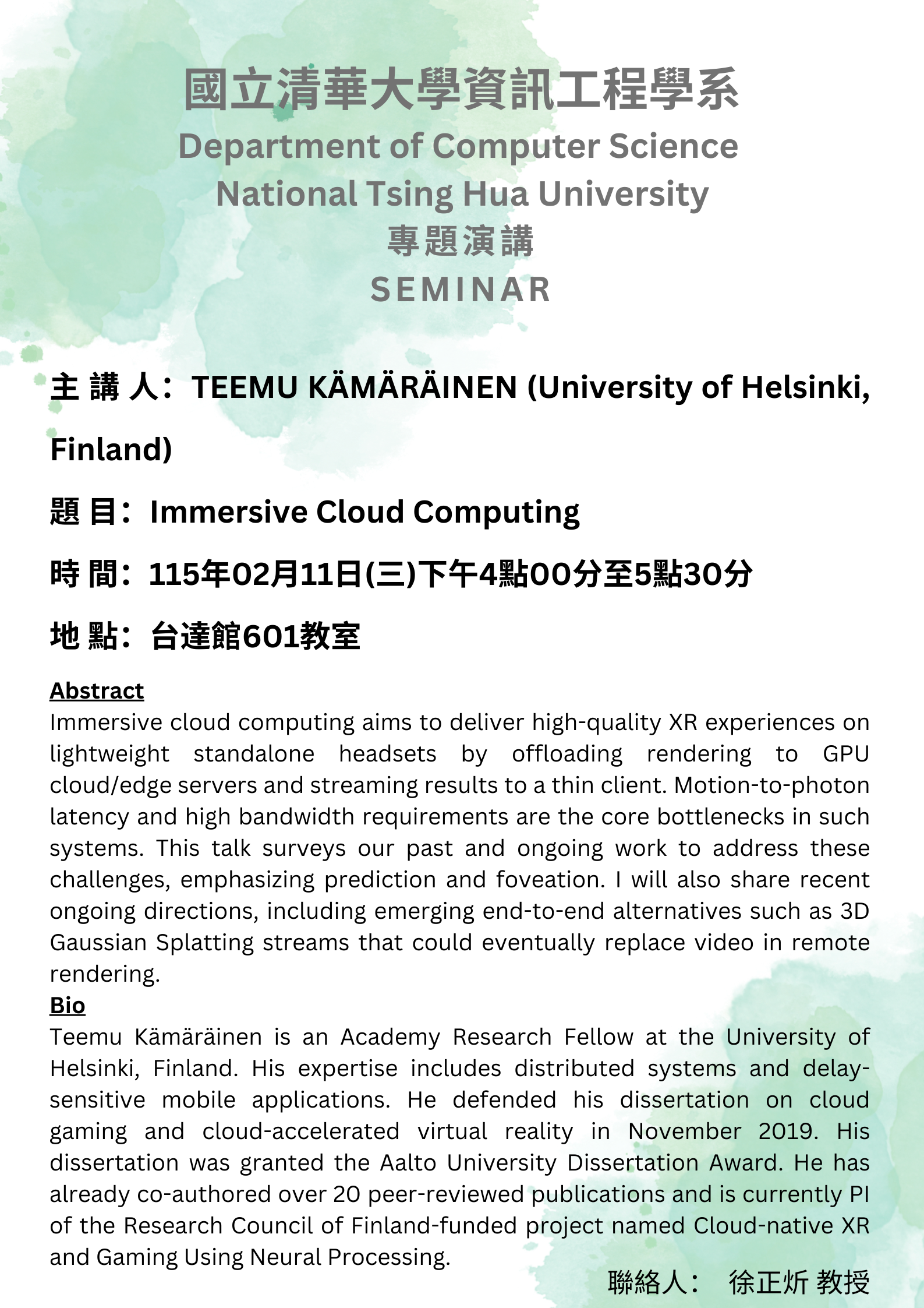 2/11 (三) Immersive Cloud Computing 主講人:TEEMU KÄMÄRÄINEN (University of Helsinki, Finland)