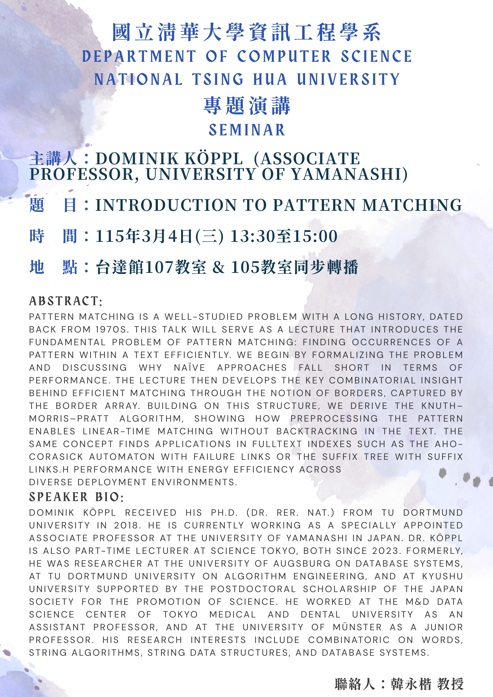 3/4 (三) Introduction to Pattern Matching 主講人:Dominik Köppl (Associate Professor, University of Yamanashi)