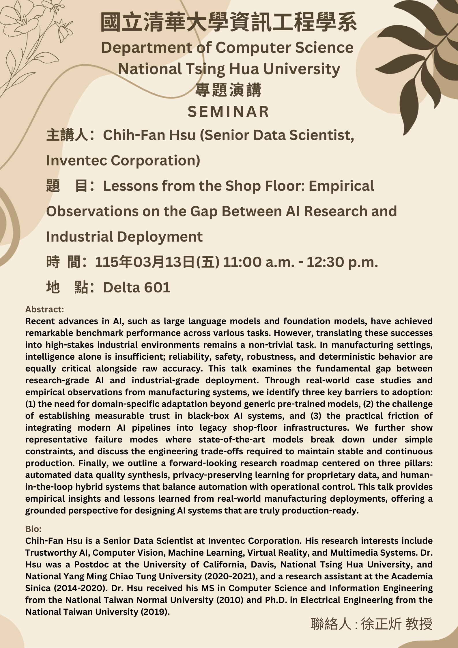 3/13 (五) Lessons from the Shop Floor: Empirical Observations on the Gap Between AI Research and Industrial Deployment 主講人: Chih-Fan Hsu (Senior Data Scientist, Inventec Corporation)