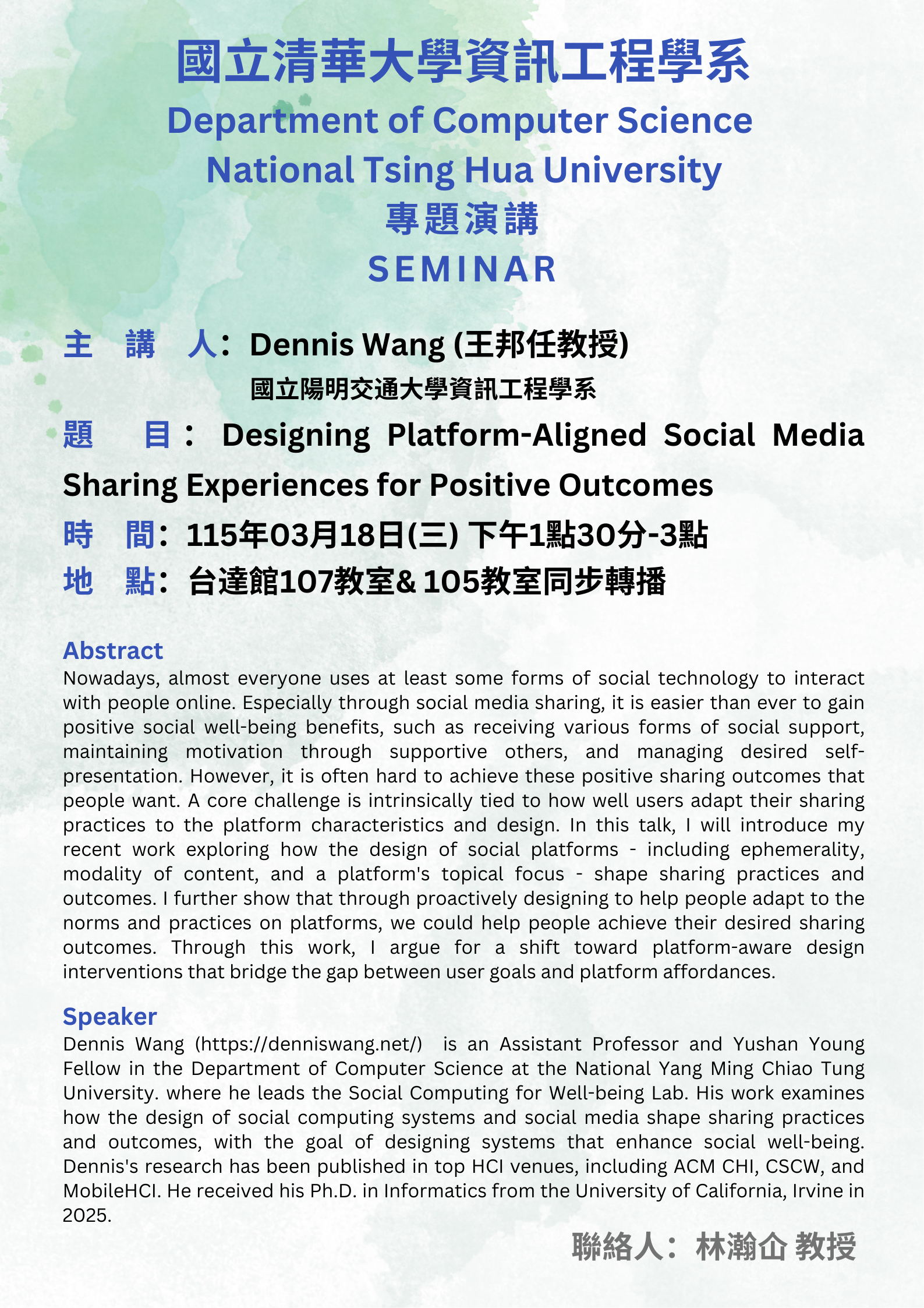 3/18 (三) Designing Platform-Aligned Social Media Sharing Experiences for Positive Outcomes 主講人: Dennis Wang