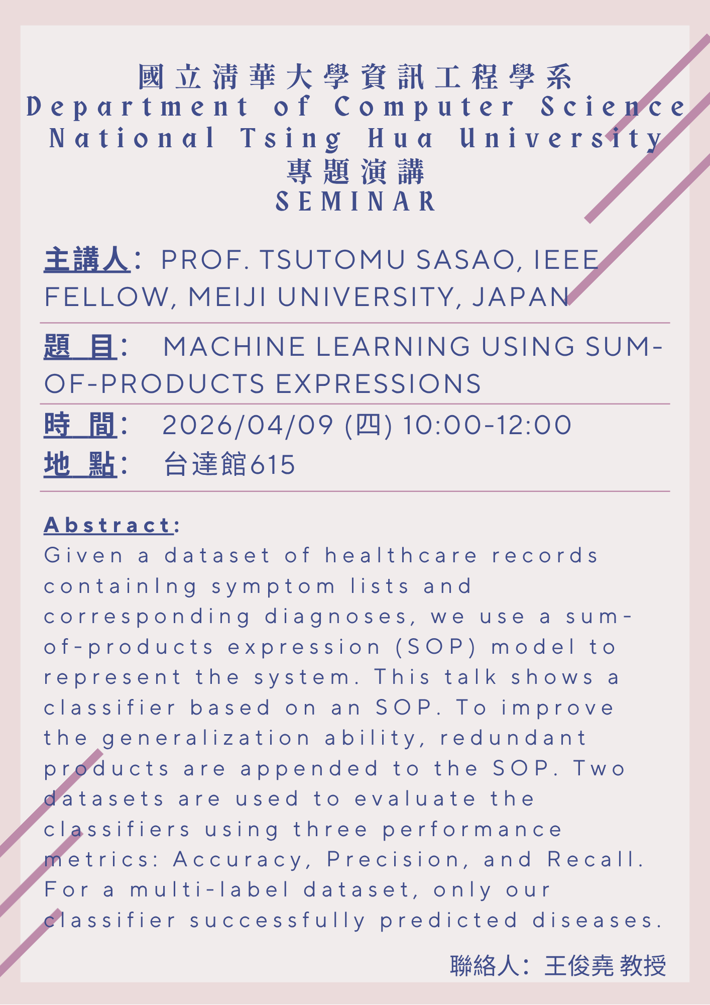 4/9 (四) Machine Learning using Sum-of-Products Expressions 主講人: Prof. Tsutomu Sasao, IEEE Fellow, Meiji University, Japan