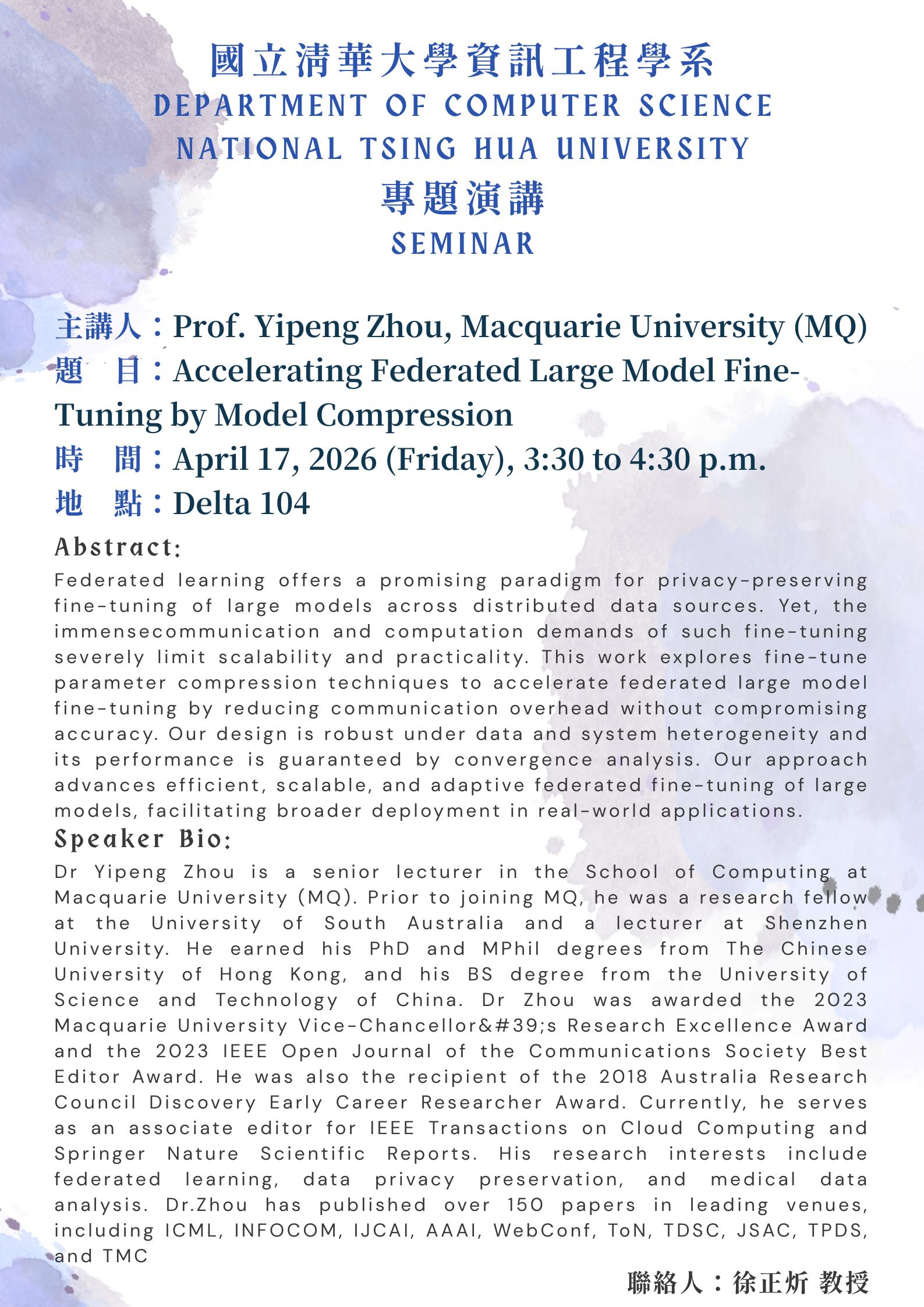 4/17 (五) Accelerating Federated Large Model Fine-Tuning by Model Compression 主講人: Prof. Yipeng Zhou, Macquarie University (MQ)